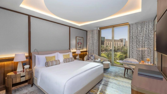 The hotel features 224 spacious rooms and suites, combining tasteful Arabesque design elements with contemporary elegance. Each room is furnished with luxurious décor and equipped with advanced technology, including a flat-screen satellite TV and touch-screen controls for lighting, climate, and curtains.
