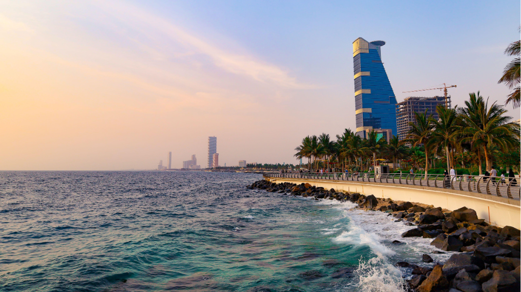 The Corniche (كورنيش جدة) is a long, beautiful walkway along the coast of Jeddah (جدة). It runs beside the Red Sea (البحر الأحمر). The Corniche is a favorite place for people to walk, relax, and enjoy the sea view. It is full of parks, cafes, and places to sit and watch the water.